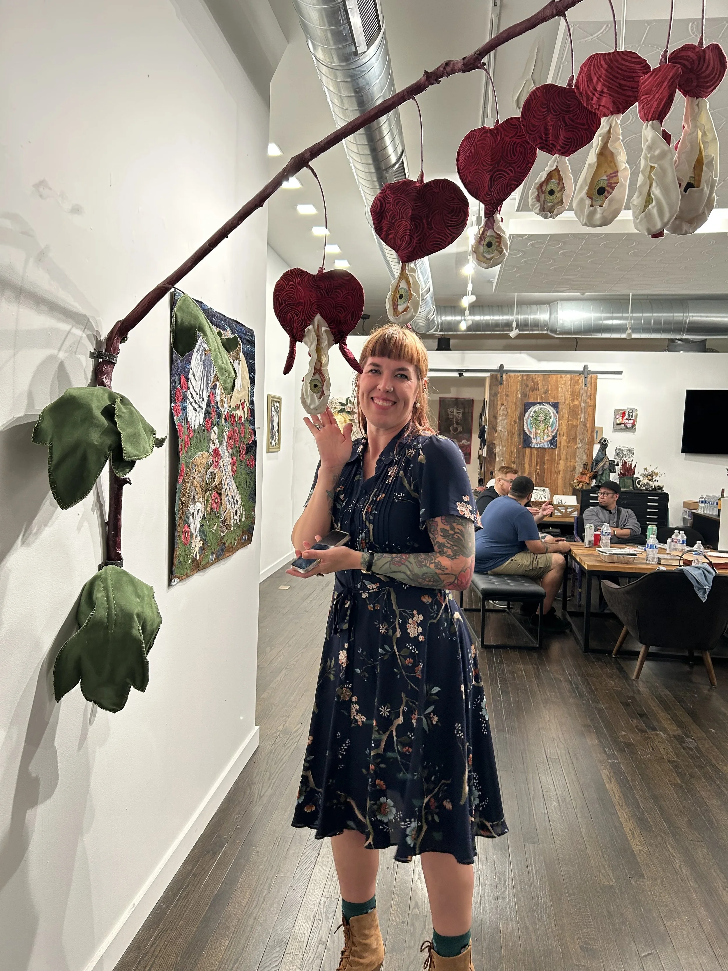 Hi, it’s me Micael. I’m an experimental textile artist, sculptor, and mother in Kansas City. As an artist living in the late stages of a capitalist society that is failing because a few hoard resources and value materialism over living things, I feel it is my duty to document the beauty of the people, plants, and creatures living on Earth as well as the planet herself. My work centers on the emotional, scientifically proven quantum connection that we share with everything on the planet. I am interested in Catholic iconography, the mysticism of the Renaissance, and the lives and work of great women artists like Frida Kahlo, Remedios Varo, and Artemisia Gentileschi. After a childhood of Catholic Church and education, I am infatuated with ritual, symbolism, the macabre, opulence, and the erasure of many women of the Bible. I have spent years unlearning my indoctrination and discovering a new spirituality founded on honoring the divine feminine. My spiritual practice and my creative practice are one and the same. My work is ritual and connection, a catalyst to the divine. My practice is a devotion and dedication to the beauty of life, death, partnership, cooperation, and balance.